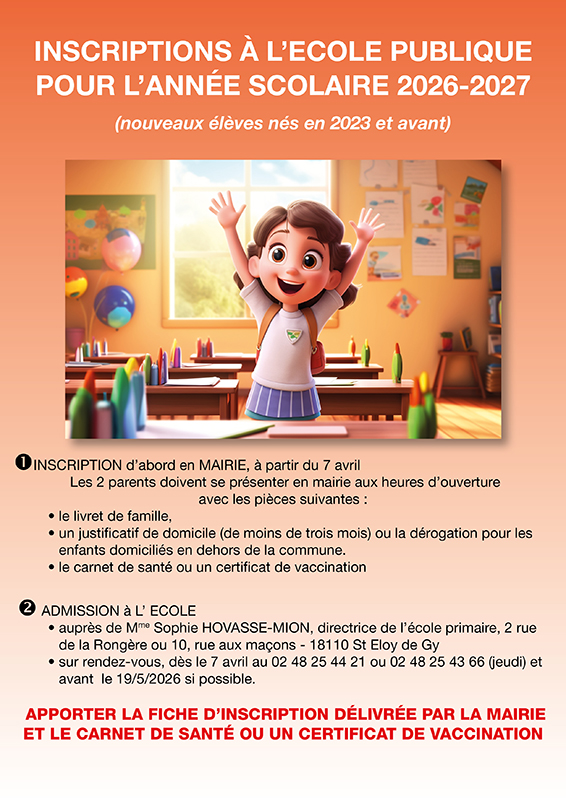 Inscriptions à l’ECOLE publique pour l’année scolaire 2026-2027